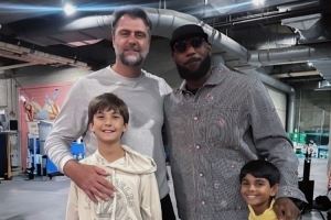 姚明苦主!詹姆斯今日赛后与爵士名宿奥库寒暄并合影